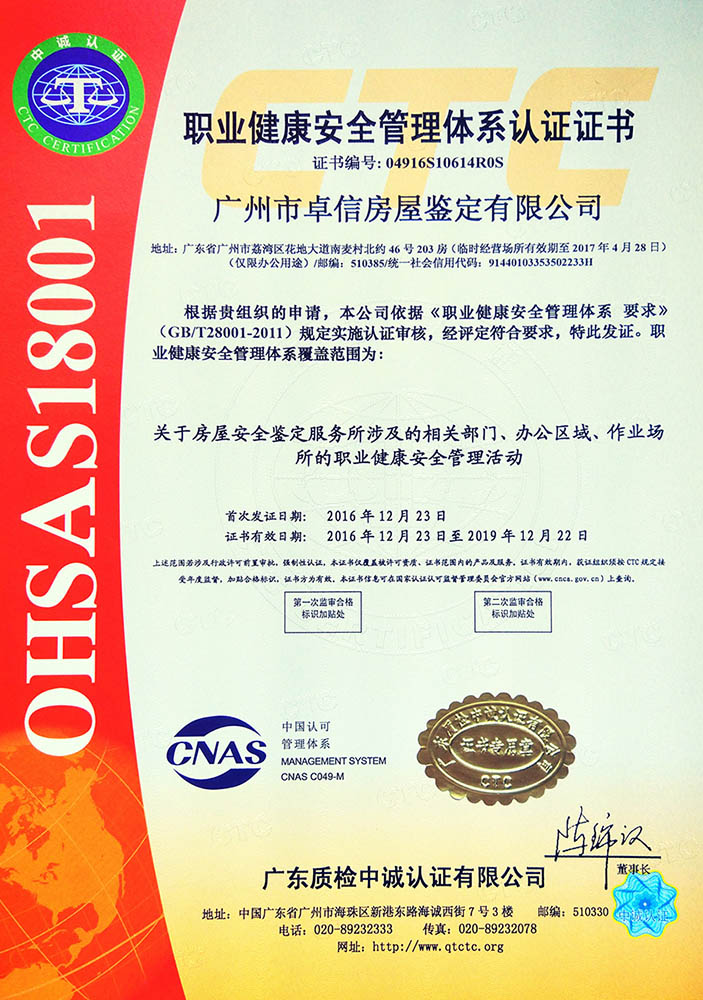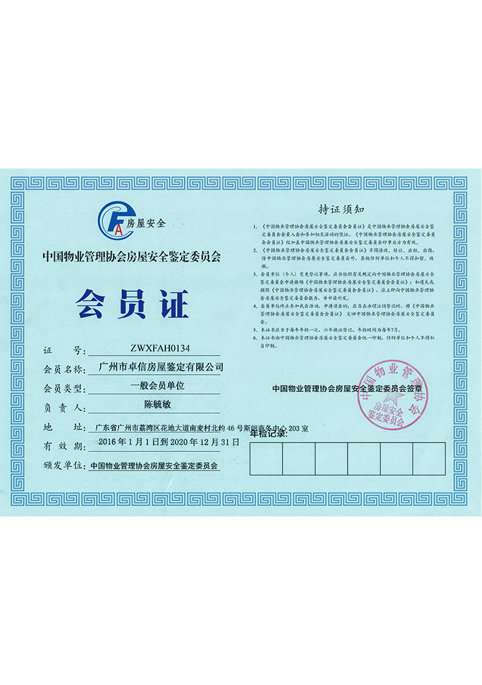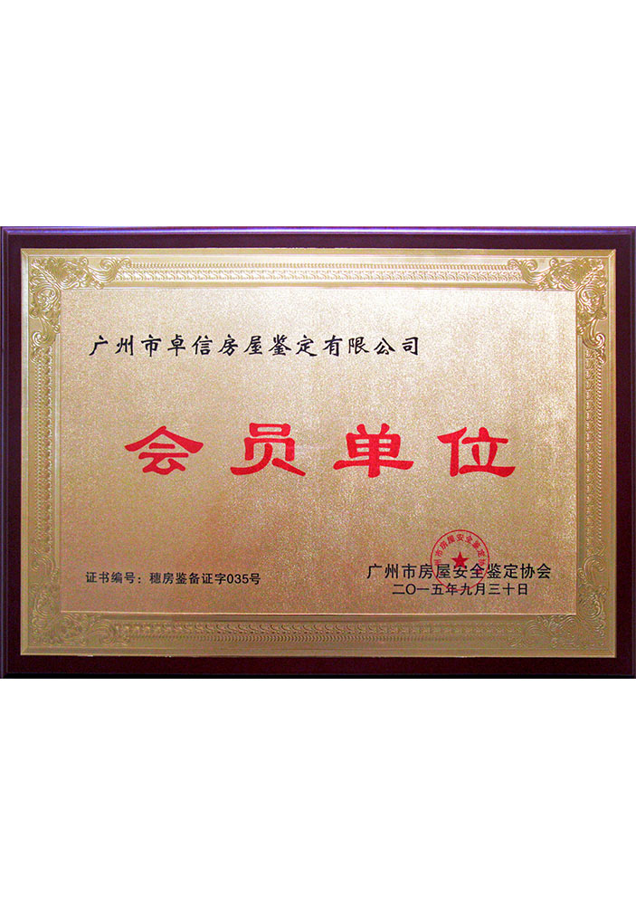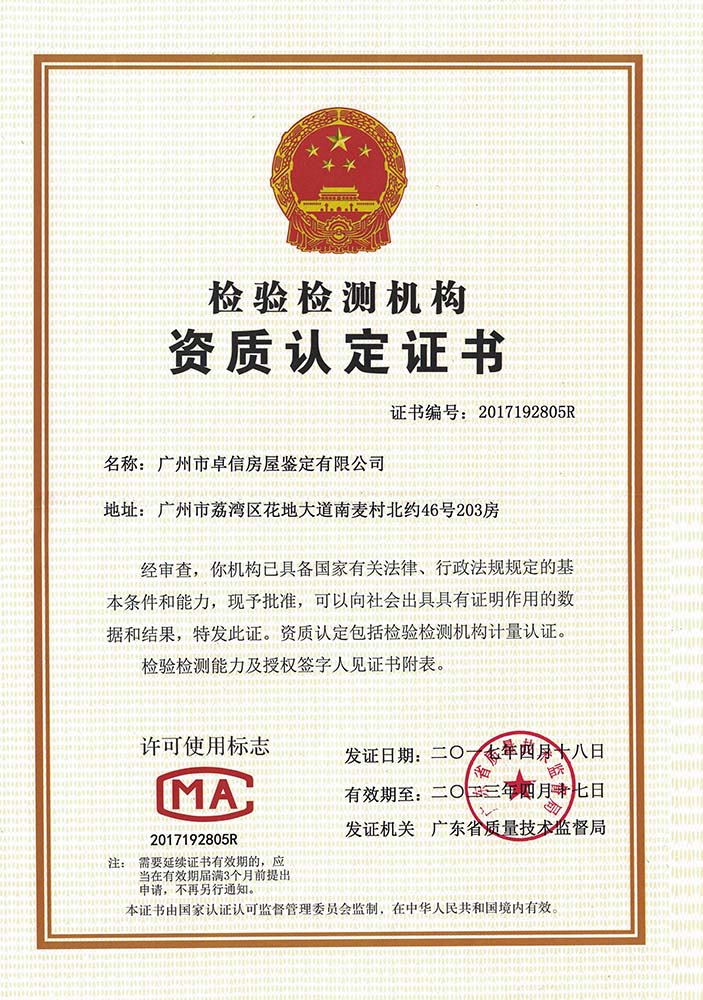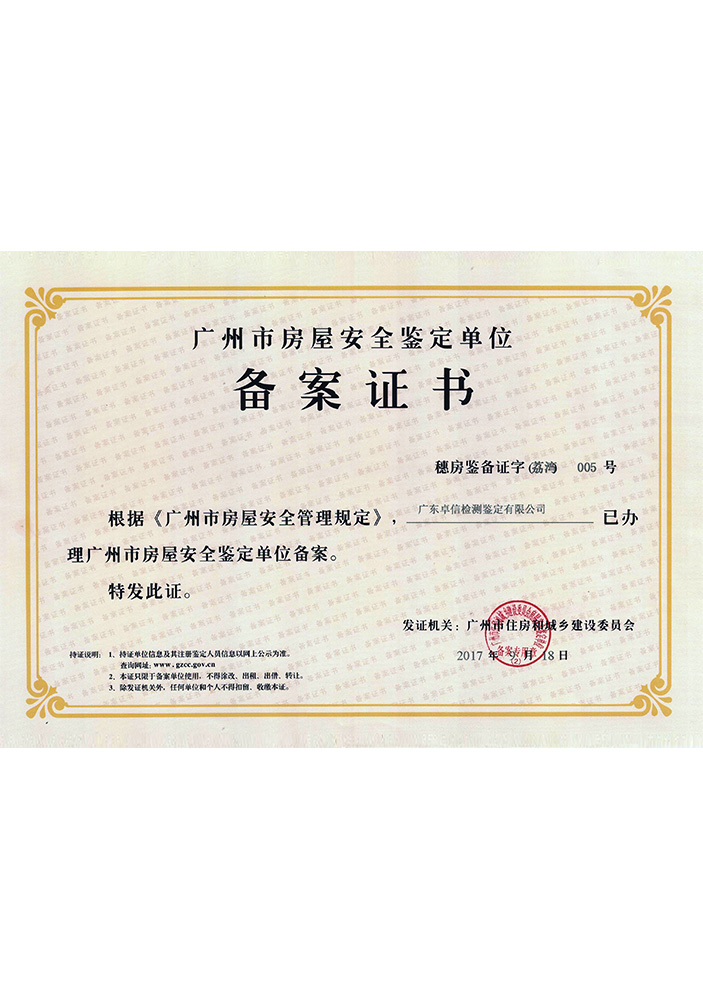 廣東卓信檢測(cè)鑒定有限公司(原廣州市卓信房屋鑒定有限公司)是廣州市工商行政管理局批準(zhǔn)并經(jīng)廣州市住房和城鄉(xiāng)建設(shè)委員會(huì)核準(zhǔn)成立的房屋安全鑒定單位,持有廣州市住房和城鄉(xiāng)建設(shè)委員會(huì)核發(fā)的《廣州市房屋安全鑒定單位備案證書》的專業(yè)從事各類房屋檢測(cè)鑒定的技術(shù)服務(wù)機(jī)構(gòu);是廣州市房屋安全鑒定協(xié)會(huì)、廣東省建設(shè)工程質(zhì)量安全檢測(cè)和鑒定協(xié)會(huì)、中國(guó)物業(yè)管理協(xié)會(huì)房屋安全鑒定委員會(huì)會(huì)員單位。