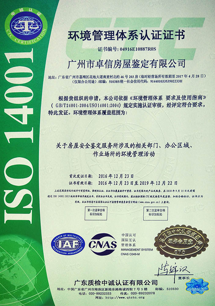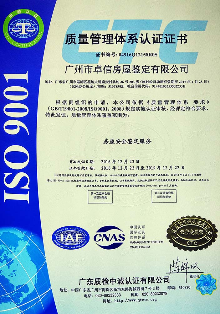 ◆ 公司目前分別在深圳、惠州、梅州、河源、湛江、韶關(guān)等地區(qū)設(shè)立了分公司。為構(gòu)建科學(xué)合理的質(zhì)量操作管理體系,公司通過了質(zhì)量管理體系、職業(yè)健康安全管理體系、環(huán)境安全體系三大體系的ISO認(rèn)證;通過了CMA國(guó)家計(jì)量認(rèn)證;獲得房屋安全鑒定機(jī)構(gòu)甲級(jí)能力認(rèn)定;確保鑒定工作從委托、策劃、現(xiàn)場(chǎng)、報(bào)告完成的整套可控、可靠的規(guī)范流程。