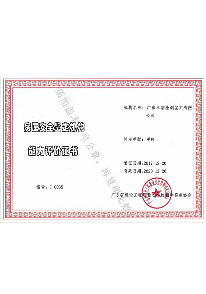 • 房屋安全鑒定機(jī)構(gòu)能力評(píng)價(jià)證書